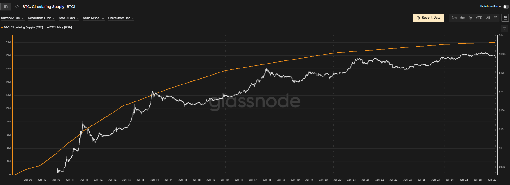 Svet kryptomien práve prekročil kľúčovú hranicu. Z celkového konečného množstva 21 miliónov Bitcoinov, ktoré kedy budú existovať, už ťažobná sieť vyprodukovala rovných 20 miliónov mincí, ukazujú údaje Glassnode. To znamená, že pre nasledujúcich 150 rokov, až do roku 2140, ostáva na vyťaženie už len posledný jeden milión. Táto skutočnosť zásadne mení dynamiku trhu, pretože ponuka nových Bitcoinov sa bude v nasledujúcich rokoch drasticky znižovať.