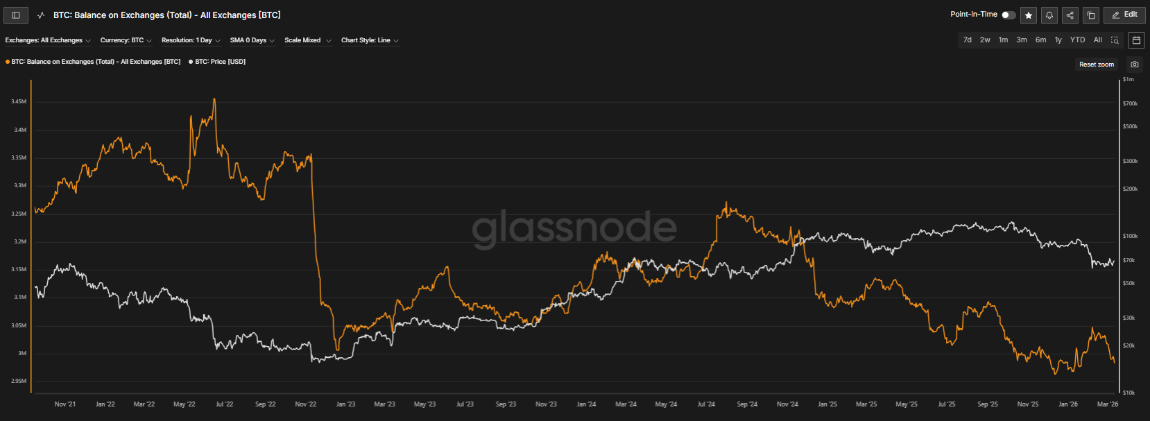 Pokles ponuky BTC na burzách. Zdroj: glassnode.com