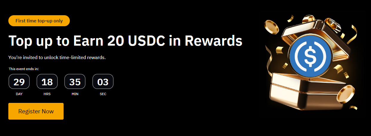 - Po úspešnej registrácii získa 20 USDC bonus, ktorý sa automaticky pripíše po prvom nákupe.