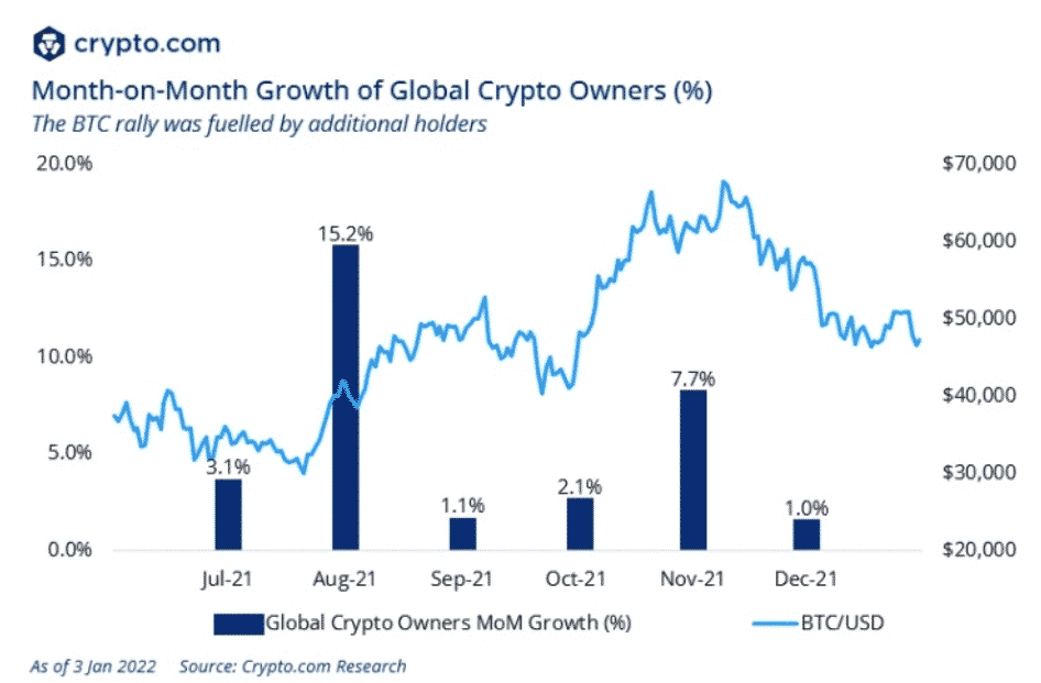 Keď sa pozrieme späť na rok 2021, globálna krypto populácia sa v roku 2021 zvýšila o 178 %, zo 106 miliónov v januári na 295 miliónov v decembri. Zatiaľ čo rok 2021 sa začal tým, že Tesla a Mastercard sa pripojili k strane s krypto platbami a adopciou, BTC bol poháňaný rastom v druhej časti roka.