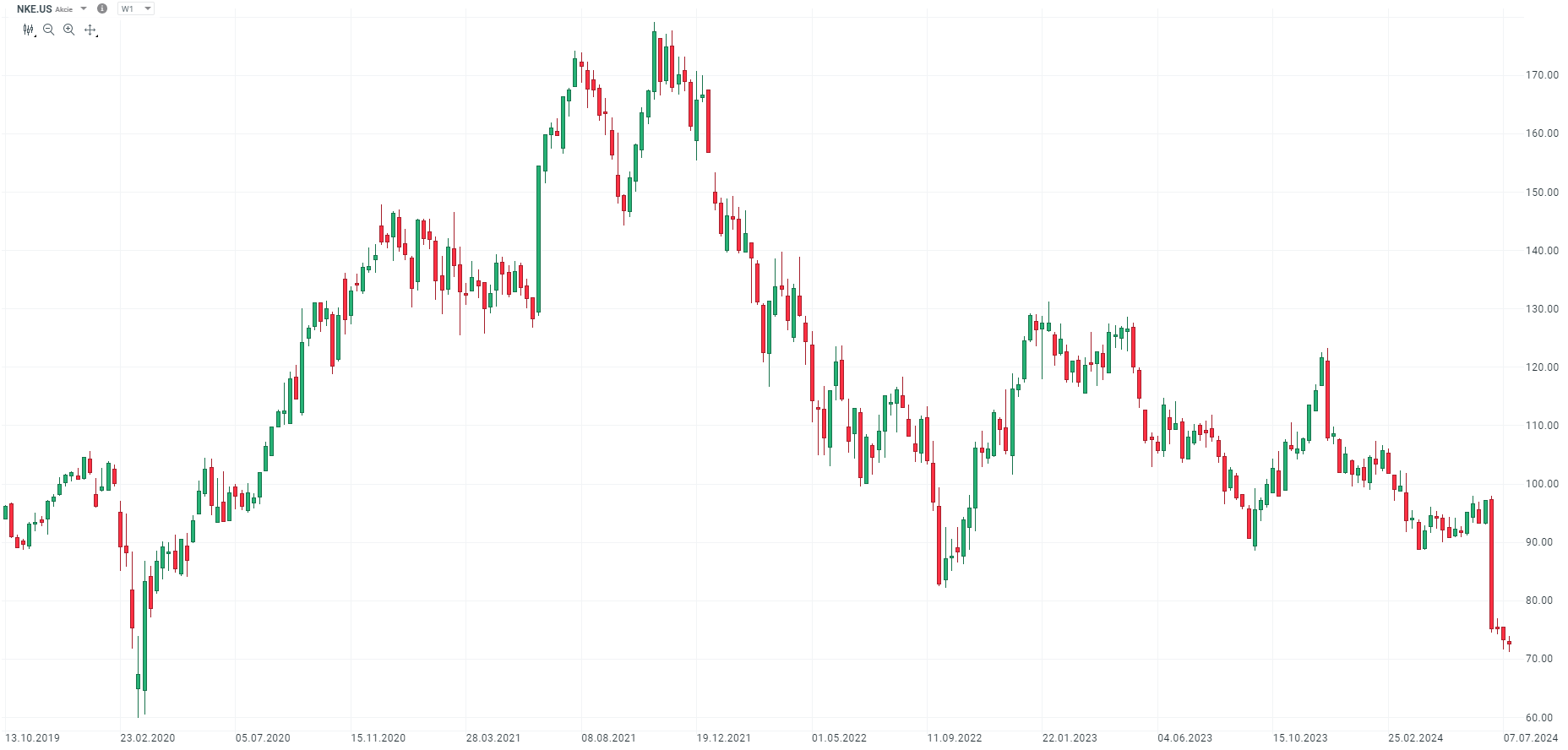 Samozrejme došlo aj na spoločnosť Nike, ktorej zlé výsledky zapríčinili prepad ceny akcie o viac ako 20 % v rámci iba jedného týždňa. Firma v posledných rokoch urobila niekoľko zlých strategických rozhodnutí, napríklad obmedzila predaj prostredníctvom iných predajcov a príliš sa spoliehala na niektoré staré modely topánok, zatiaľ čo konkurencia nespala a brala spoločnosti podiel na trhu. Nike tiež stratil niektoré veľké a známe športové tváre, ktoré si založili vlastné značky, a tiež je stále menej populárny v bežeckej komunite. Ak by sa spoločnosti podarilo obrátiť kurz, mohlo by sa po jej nedávnom prepade jednať o veľmi zaujímavú akciu. Je ale možné, aby sa Nike dostal späť na výslnie
