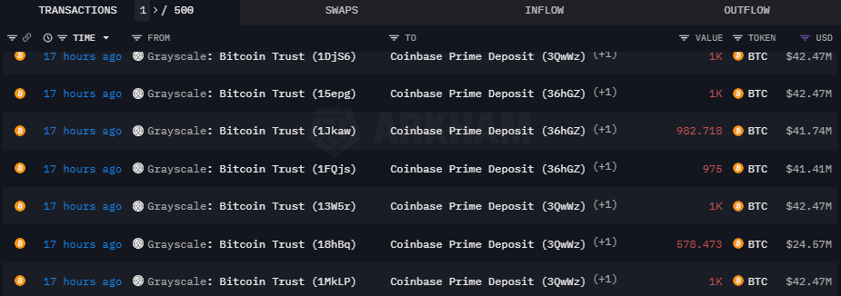 Grayscale presúva Bitcoin na Coinbase. Zdroj: Arkham Intelligence