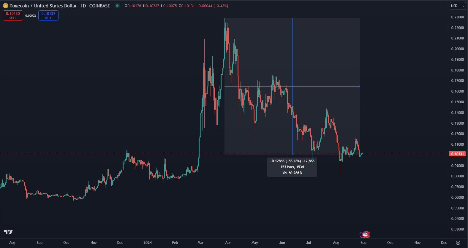 Dogecoin je v čase vydania článku 8. najväčšou kryptomenou na svete podľa údajov CoinMarketCap. Dosahuje trhovú kapitalizáciu 14,78 miliardy dolárov a denný objem obchodovania v hodnote 576,12 milióna dolárov. Zároveň je to najväčší meme coin na svete. Podľa údajov TradingView DOGE klesol za posledných 150 dní o 56 %.