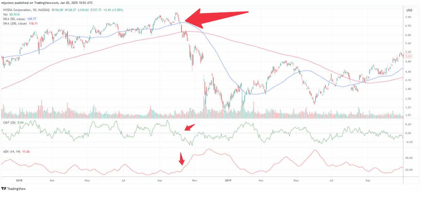 V súčasnosti sa cena akcií Nvidia obchoduje na úrovni 144,47 dolára, čo predstavuje nárast o takmer 200 % v priebehu roka 2024. Technické indikátory však naznačujú možný pokles. Chaikinov indikátor peňažného toku (CMF) sa už dva mesiace pohybuje blízko nuly, čo signalizuje riziko korekcie. Priemerný smerový index (ADX) sa od septembra drží okolo hodnoty 20, podobne ako v roku 2018, čo naznačuje slabý rastúci trend. Graf nižšie zobrazuje situáciu z roku 2018.