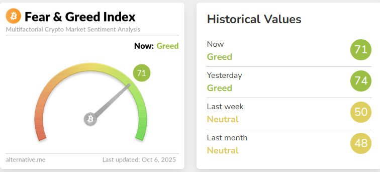 Podľa údajov z platformy Alternative sa nálada na trhu zlepšuje. Index strachu a chamtivosti dosiahol hodnotu 71, čo zodpovedá optimizmu. V minulosti sa pri veľkých trhových vrcholoch hodnota indexu šplhala až nad 80, čo signalizovalo extrémnu chamtivosť a predchádzalo masívnym výpredajom.