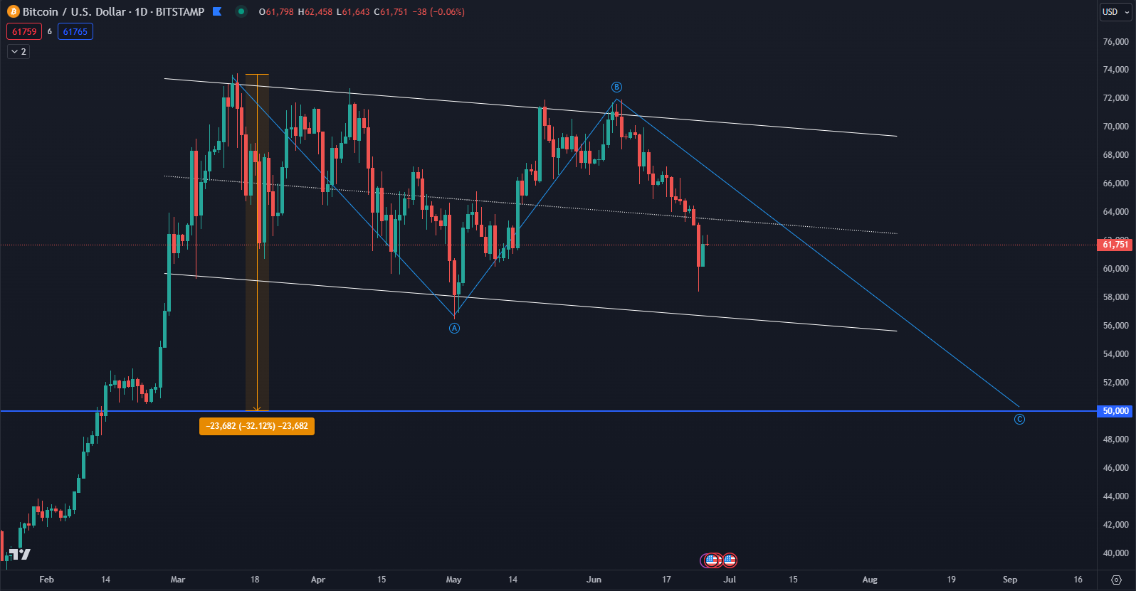Začiatkom mája sa vytvorilo najnižšie minimum na úrovni 56 500 dolárov. Ak by Bitcoin klesol pod túto hranicu, zrejme by sme ďalší odraz hľadali až niekde okolo 50 000 dolárov. Štruktúra trhu by potom potvrdila vzorec, ktorý sa nazýva ABC korekcia, kde pád medzi bodmi B a C je mohutnejší ako pád medzi A a B.