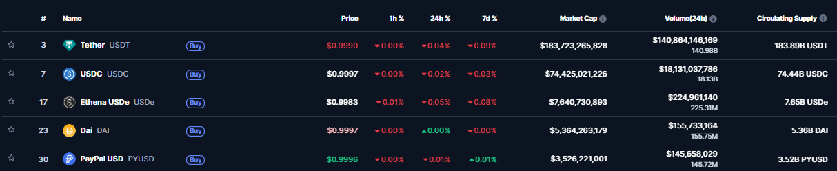 Najväčšie stablecoiny podľa kapitalizácie. Zdroj: coinmarketcap.com