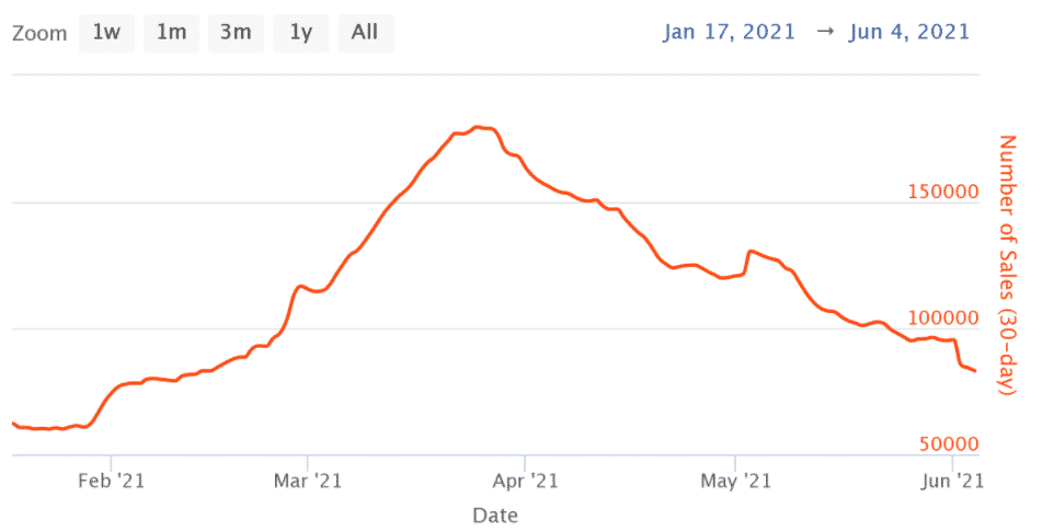 Aj keď súčasné štatistiky môžu vyzerať zle, je vidieť, že priemerný počet predajov vzrástol medzi januárom a koncom mája takmer o 300%. To ukazuje, že v tomto sektore existuje sila napriek prepadu trhu, ktorý sa začal 12. mája.