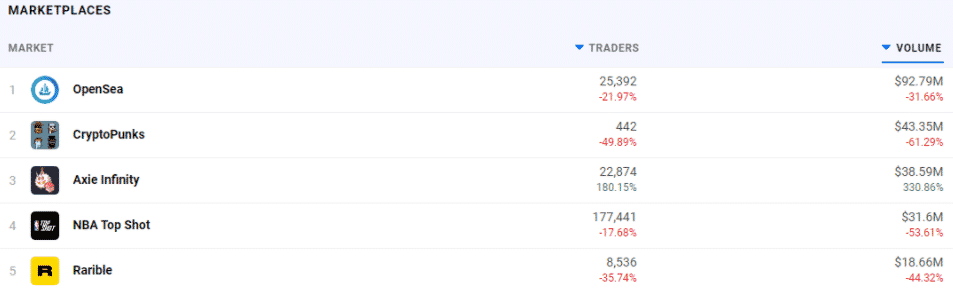 Top NFT trhy. Zdroj: DappRadar