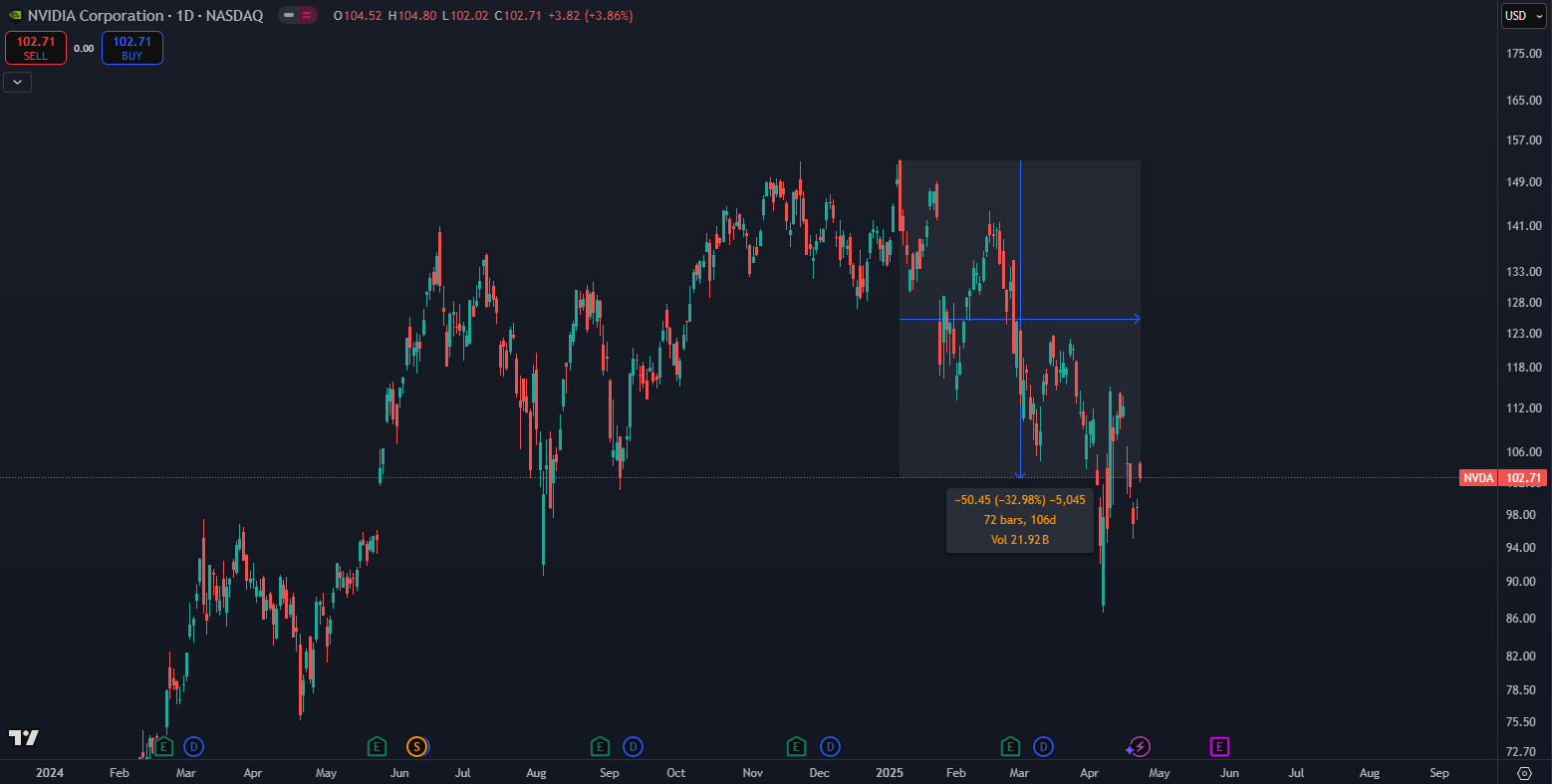 Akcie ako NVDA by čoskoro mohli zaznamenať opätovné oživenie po tom, čo Donald Trump vyhlásil, že odvetné clá na Čínu by mohli čoskoro skončiť. Navyše vyhlásil, že nemá v pláne prepustiť Powella, hoci by privítal zníženie úrokových sadzieb.