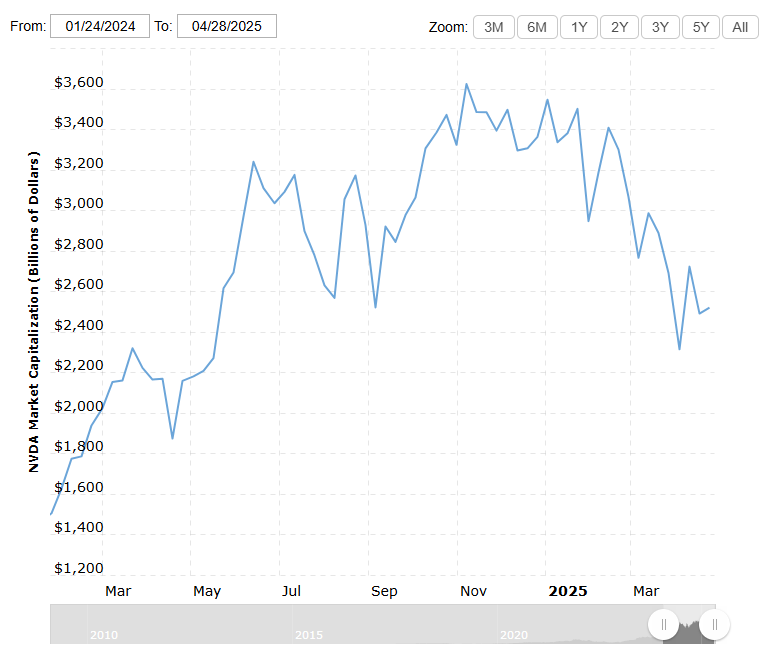 Pokles kapitalizácie firmy Nvidia. Zdroj: macrotrends.net