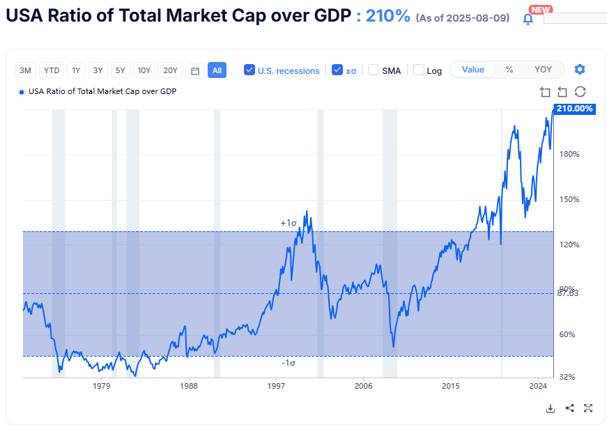 Z grafov na TradingView vyplýva, že Nasdaq dosiahol historické maximá, zatiaľ čo Bitcoin sa zotavil a nedávno opätovne prekonal magickú hranicu 120 000 dolárov. Americký pomer trhovej kapitalizácie k HDP podľa údajov GuruFocus aktuálne dosahuje 210 %, čo výrazne prevyšuje dlhodobý priemer a dokonca aj úrovne pred finančnou krízou v rokoch 2007–2008.