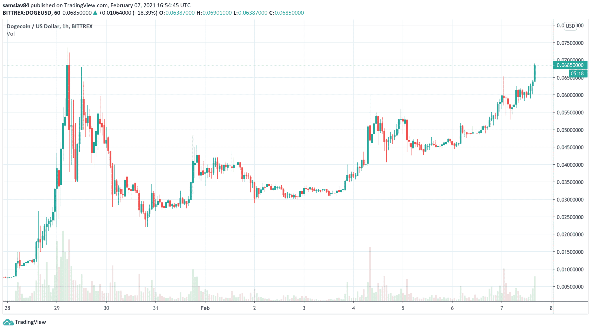 Celé to začal ešte pred dvoma týždňami Elon Musk, ktorý Dogecoin vyhypoval tak, že sa z ceny 0,0073 $ v priebehu dvoch dní dostal na aktuálne historické maximum 0,073 $. To je rast o tisíc percent!