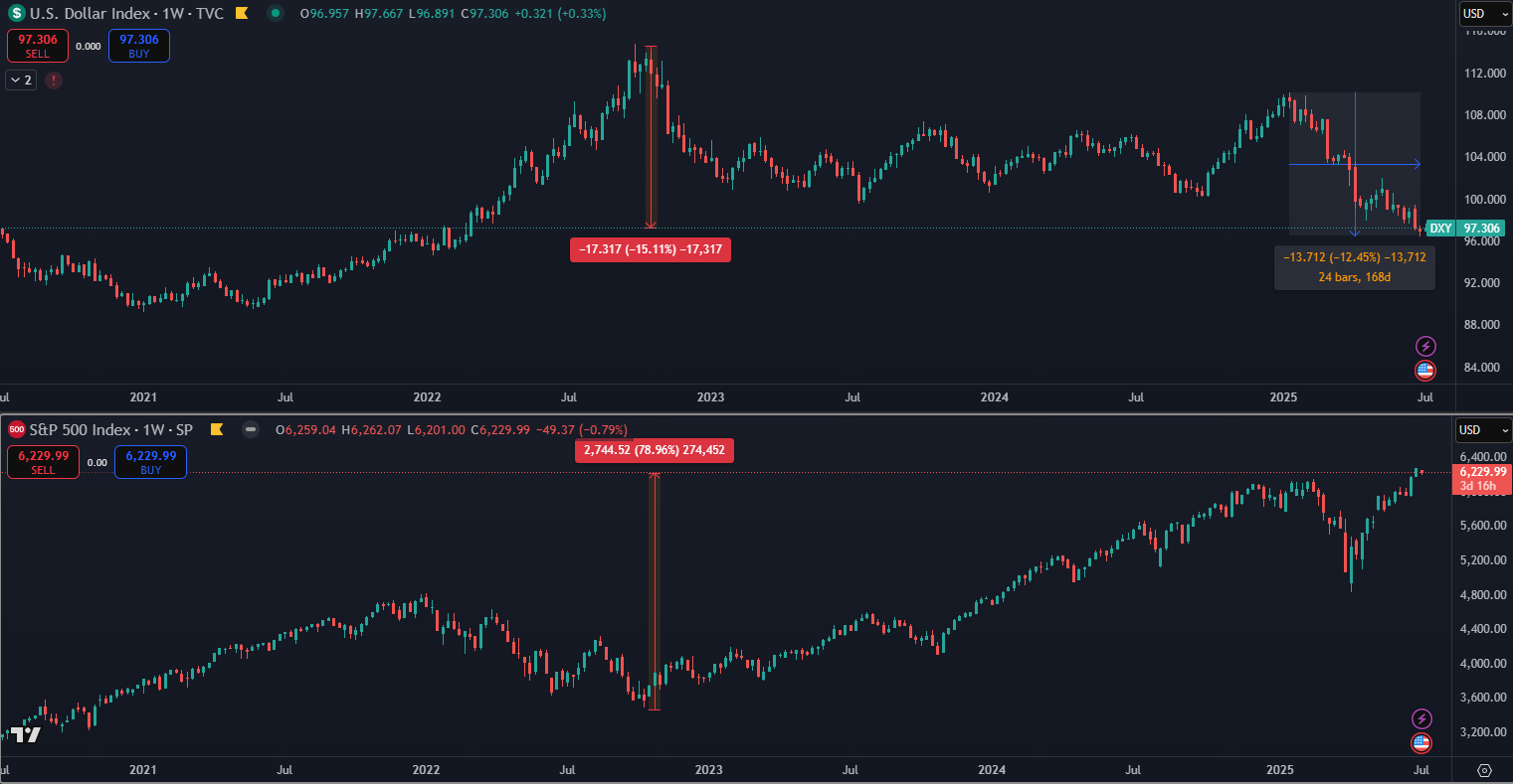 Americké akcie sa tešia priaznivému vývoju, no zároveň je na pozadí citeľný prepad dolárového indexu DXY. Tento index meria hodnotu amerického dolára voči košu hlavných svetových mien, ako je euro, japonský jen či britská libra. Kým akcie rástli, dolár od októbra 2022 najprv prudko oslabil a následne sa dva roky pohyboval do strany.