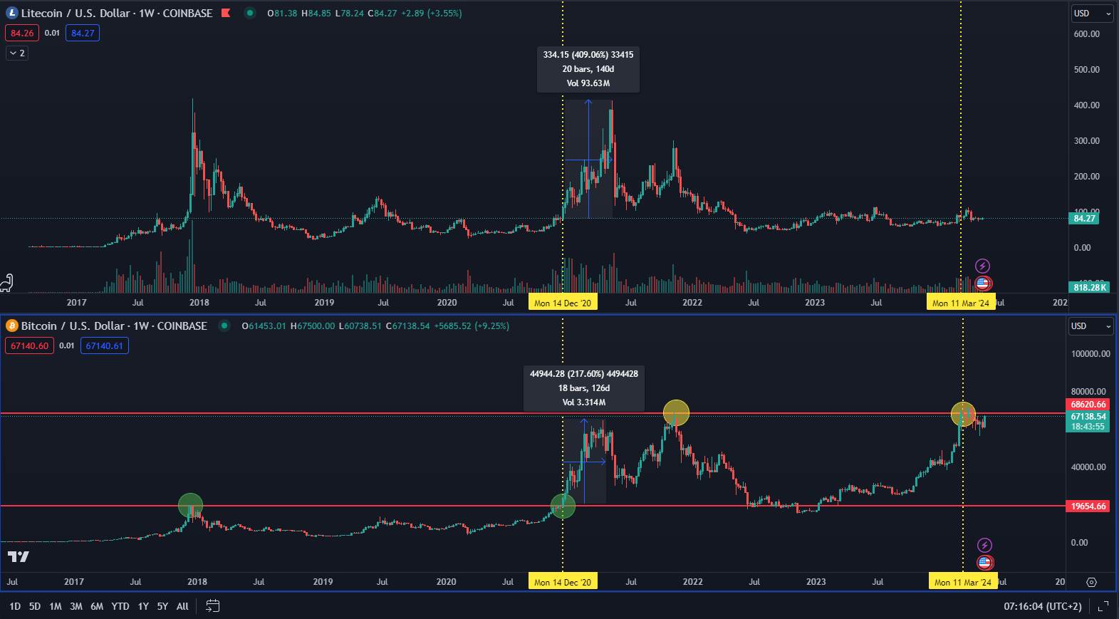 Sme vo fáze trhu, kedy Bitcoin nedávno sformoval nové historické maximum. Poďme si porovnať na príklade, ako sa správali altcoiny bezprostredne po tejto fáze predošlý cyklus. Budeme si to demonštrovať na Litecoine. Bitcoin prekonal predošlé ATH 20 000 dolárov v polovici decembra 2020 (zelený kruh). Všimnite si, že v tom istom momente bol Litecoin iba na úplnom počiatku exponenciálneho rastu.