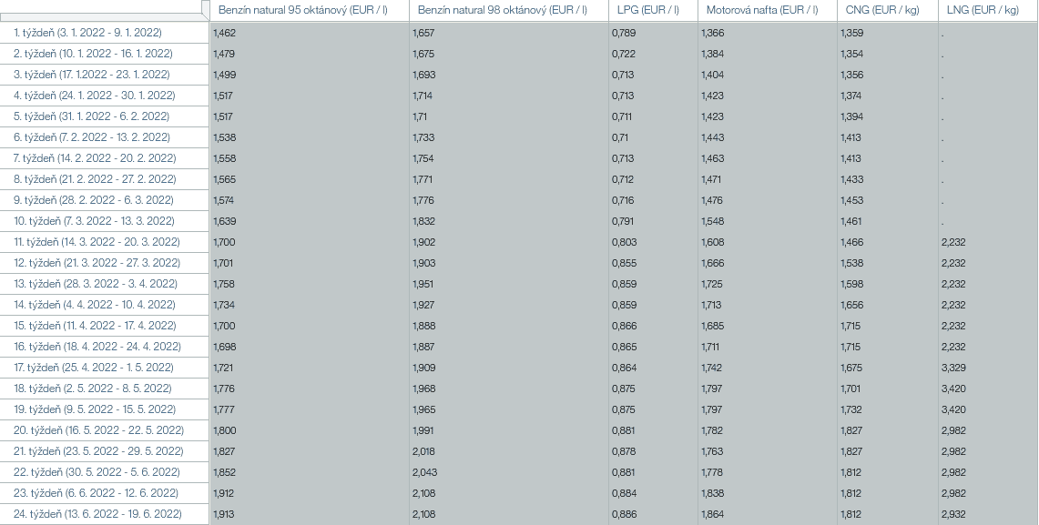 Tabuľka nižšie poskytuje detailný prehľad o zvyšovaní cien pohonných hmôt na Slovensku od januára 2022. Posledné dostupné dáta obsahujú tieto ceny: