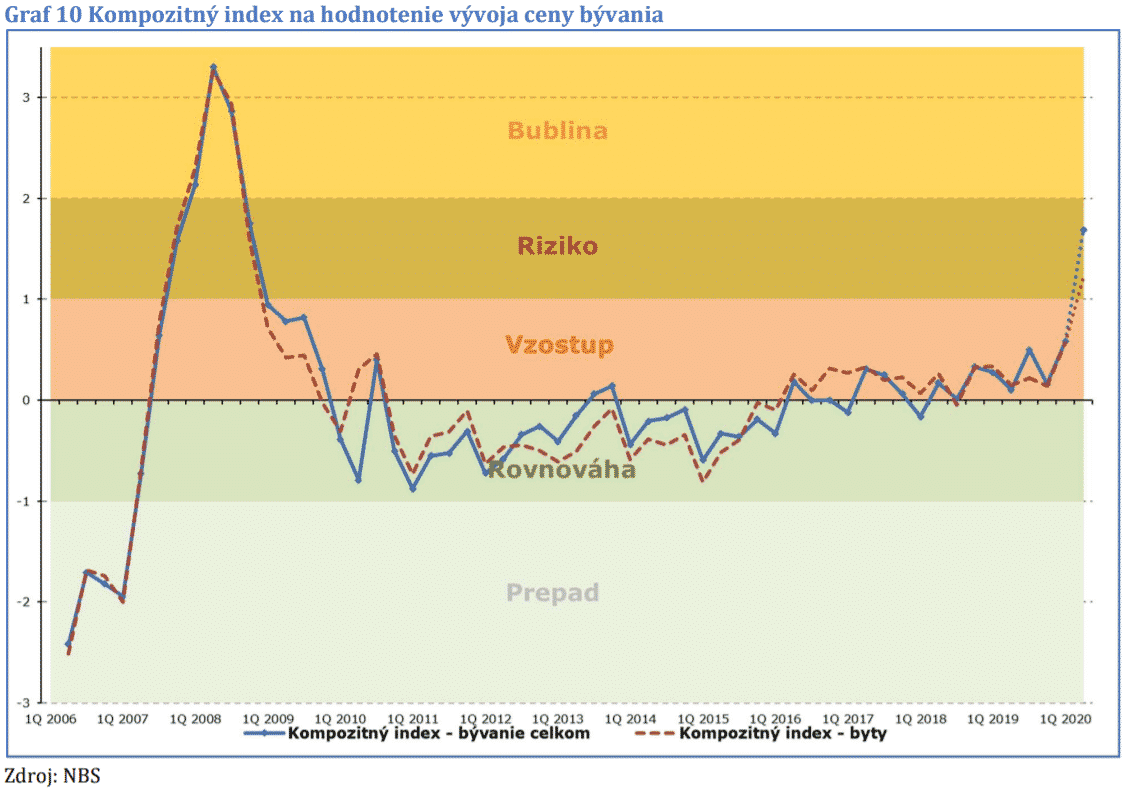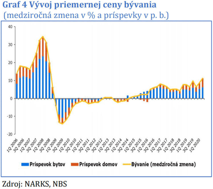 Národná Banka Slovenska (NBS) vo svojom komentári k realitnému trhu zhrnula prekvapivý vývoj udalostí v druhom štvrťroku 2020, keď ceny nehnuteľností na Slovensku rástli, zatiaľ čo ekonomika padala do recesie a prehlbovala sa kríza. Pandémia koronavirusu, spolu s ňou spojená ekonomická recesia a rast nezamestnanosti podľa NBS zatiaľ na ceny bývania nemali vplyv.