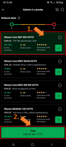 - Investor si zvolí portfólio podľa svojich cieľov a rizikového profilu. Môže si vybrať tematické oblasti (napr. technologické, ekologické či dividendové ETF) alebo vytvoriť vlastnú kombináciu.
