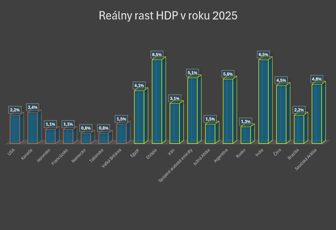 Na grafe sú oranžovou farbou znázornené krajiny G7 a žltou farbou BRICS. Jasne vidieť, že G7 v raste reálneho HDP značne zaostáva.
