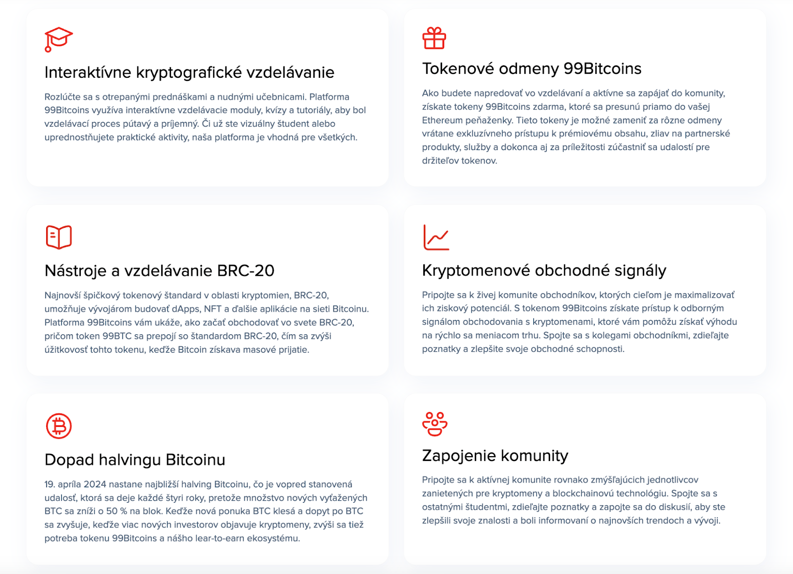 Atraktivitu projektu 99Bitcoins nezvyšuje len prechod na bitcoinovú sieť. Majiteľom nových tokenov ponúka hneď trojicu možností, ako si zaistiť pasívny príjem. Prvou z nich je inovatívny mechanizmus distribúcie voľných tokenov, ktorý nazvali learn-to-earn (L2E). Ako už z názvu vyplýva, princíp prideľovania nových 99BTC spočíva vo vzdelávaní. Súčasťou tokenu je totiž 79 hodín interaktívnych učebných materiálov v podobe kvízov, testov a prednášok. Tie vám pomôžu lepšie pochopiť sféru kryptomien a naučia vás sledovať rôzne obchodné signály, ktoré môžete zužitkovať pri tvorbe vlastného investičného portfólia.