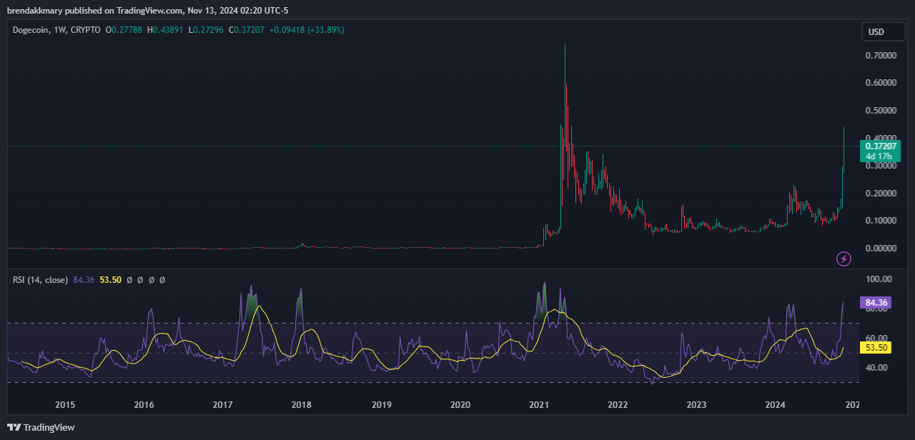 Dogecoin tiež zaznamenal pozoruhodný nárast, keď v utorok stúpol o viac ako 20 %. Digitálna mena zaznamenala od výsledku volieb pôsobivý nárast o 142 %. Napriek 10 % nárastu po oznámení nového vládneho oddelenia zostáva Dogecoin o 12 % nižšie ako jeho predchádzajúce denné maximum 0,4355 dolárov.