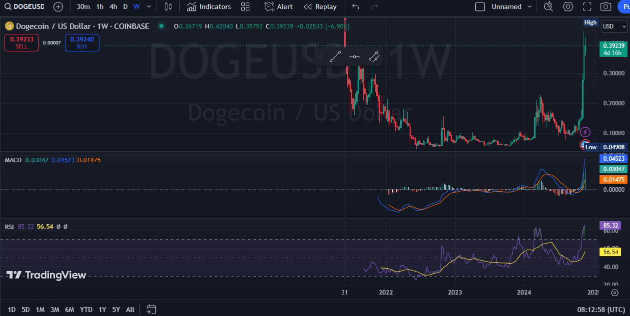 Týždenný graf Dogecoinu (DOGE/USD) odhaľuje silné rastové momentum, pričom cena nedávno vystúpila nad 0,39 dolára, čo znamená nárast o 6,3 %. RSI je na úrovni 85,23, čo naznačuje prekúpené podmienky, ale zároveň odráža intenzitu rastu. Histogram MACD naďalej ukazuje rozširujúce sa pozitívne stĺpce, signalizujúc pretrvávajúci vzostupný moment.