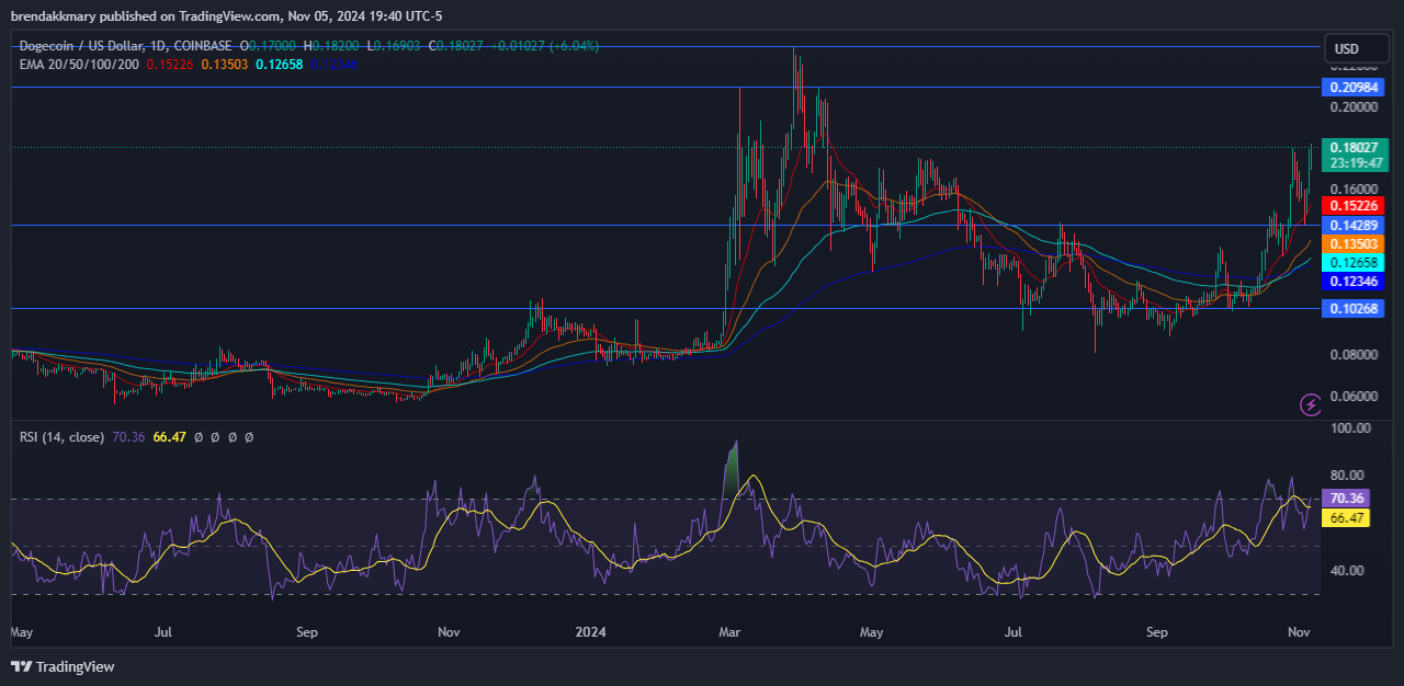 Technické ukazovatele DOGE pridávajú hĺbku tejto analýze. Relatívny index sily (RSI) nedávno vystúpil nad 70, typickú prekúpenú úroveň, ktorá často signalizuje korekciu, keď držitelia konsolidujú zisky. Navyše, 50-dňový exponenciálny kĺzavý priemer (EMA) Dogecoinu prekročil svoj 200-dňový EMA v októbri, vytvárajúc zlatý kríž často vnímaný ako rastový signál.