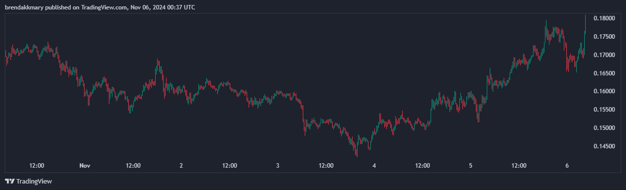 Uzavretie nad 0,162 dolára by mohlo potvrdiť prebiehajúci nákupný signál a posilniť možnosť vzostupného trendu. Akýkoľvek pohyb pod 0,141 dolára by však pravdepodobne negoval rastový výhľad, prinášajúc do pozornosti podporu na úrovni 0,111 dolára.