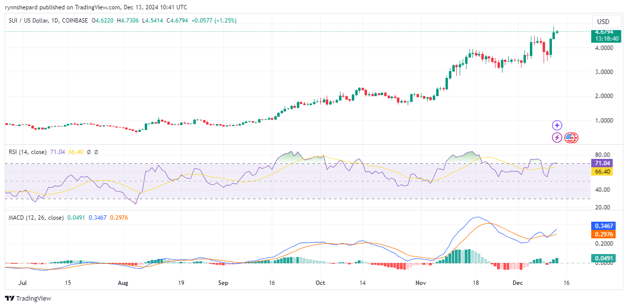 Indikátor Moving Average Convergence Divergence (MACD) na dennom grafe ukazuje býčiu konvergenciu, pričom rastúce zelené histogramy signalizujú pretrvávajúci nákupný tlak. Podobne Simple Moving Average (SMA) poskytoval konzistentnú podporu pre SUI, posilňujúc jeho vzostupný potenciál za posledný mesiac.