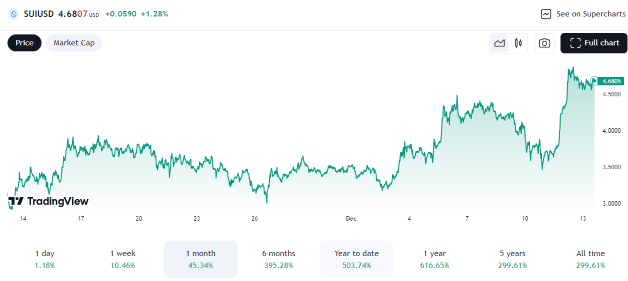 Sui zaznamenal meteorický vzostupný trend, keď od začiatku novembra zaznamenal nárast o 120 %. Vzostupná trajektória tohto altcoinu odzrkadľuje vzorce viditeľné počas býčieho behu Solany v roku 2021, pričom sa porovnávajú kvôli jeho rýchlemu rastu a trhovej dynamike.