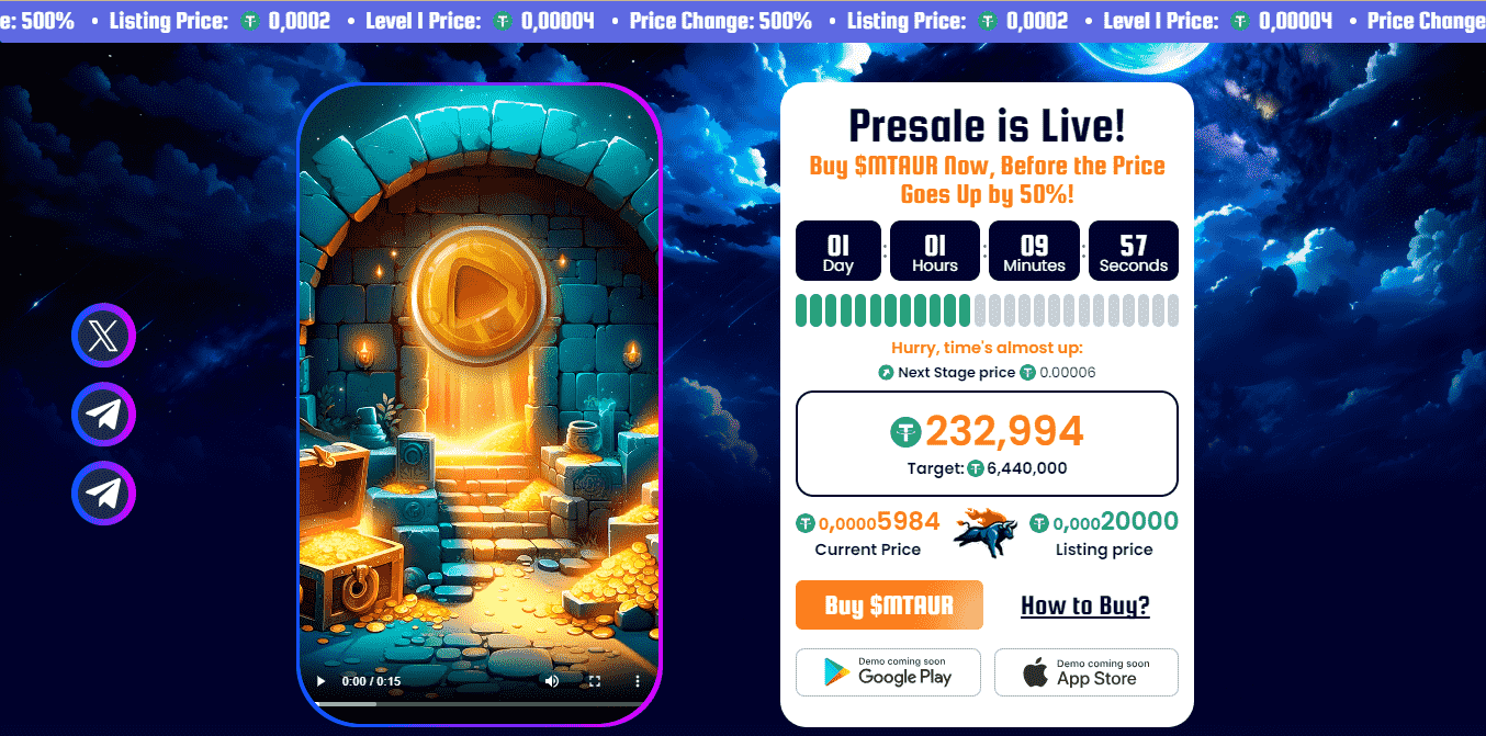 Výnimočnou črtou tohto predpredaja je štedré rozdávanie 100 000 USDT pre 100 šťastných výhercov, čo poskytuje extra motiváciu pre včasných osvojiteľov. S projekciami odhadujúcimi potenciálny 234 % nárast z ceny predpredaja na očakávanú cenu pri listingu predstavuje MTAUR zaujímavú príležitosť.