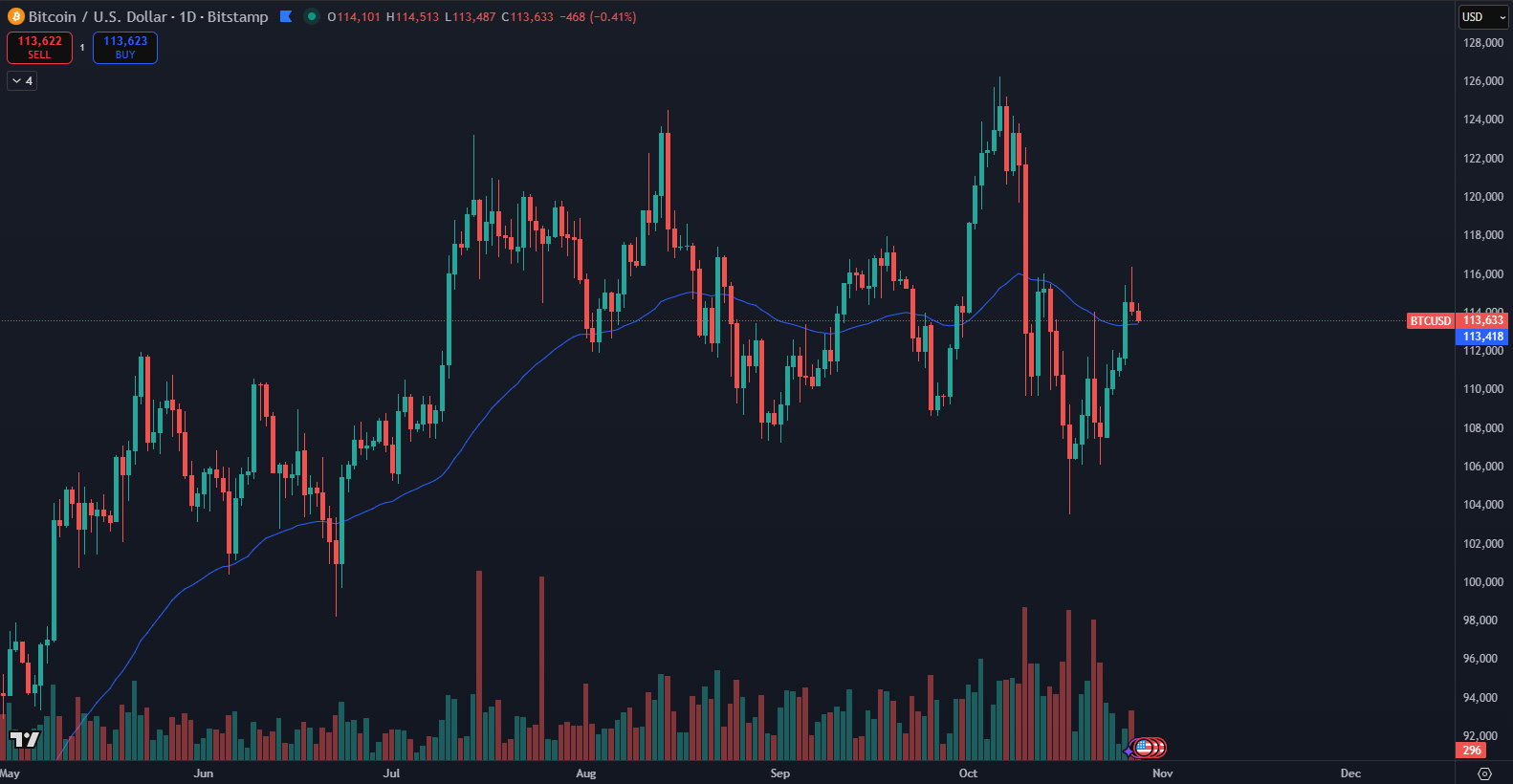 V čase písania tohto článku sa Bitcoin podľa údajov TradingView obchodoval na úrovni 113 633 dolárov, čo predstavuje pokles o 0,41 % za posledných 24 hodín. Z technického hľadiska sa Bitcoin vrátil nad 50-dňový exponenciálny kĺzavý prieme (modrá krivka) na úrovni 113 417 dolárov, čo naznačuje, že nakupujúci opäť preberajú iniciatívu.