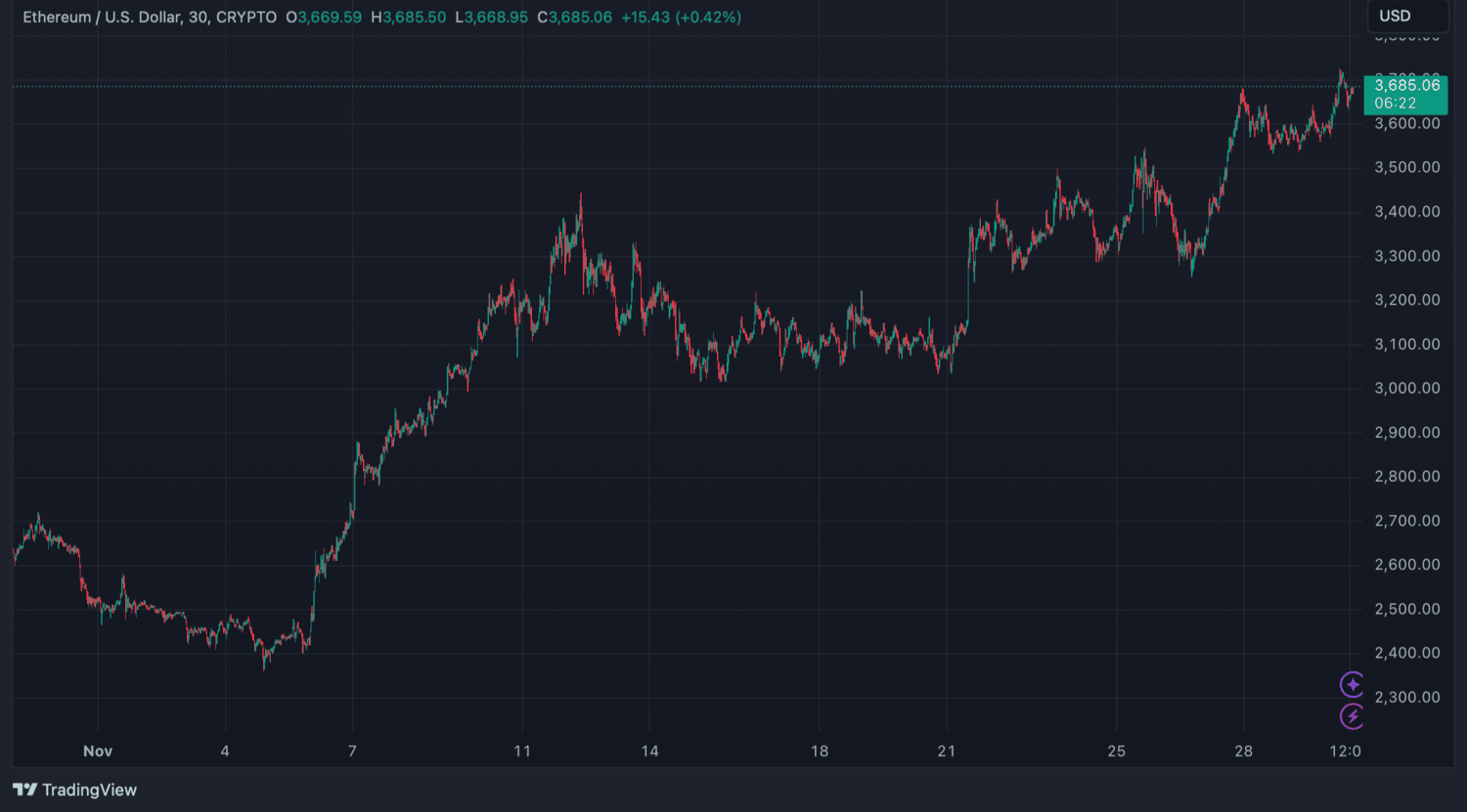 Ethereum porástlo za 1 mesiac o 15 %. Zdroj: TradingView
