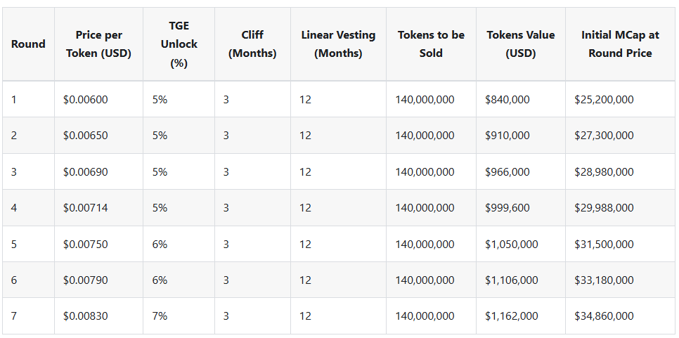 - Kolo 1: Cena 0,006 dolára, 5 % okamžité odomknutie, 3-mesačné uzamknutie, 12-mesačný lineárny vesting (uvoľňovanie tokenov).