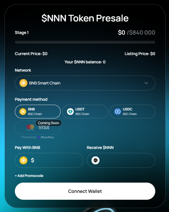 Do predpredaja sa môžete zapojiť pripojením svojej kryptopeňaženky a nákupom tokenov s kryptomenami priamo cez stránku predpredaja. Okrem toho sú podporované platby fiat – čo vám umožňuje nakupovať tokeny pohodlne pomocou kreditnej karty. Vaše tokeny NNN sa stanú nárokovateľnými po skončení predpredaja. Budete si ich môcť uplatniť manuálne z tej istej peňaženky, ktorú ste použili na nákup.
