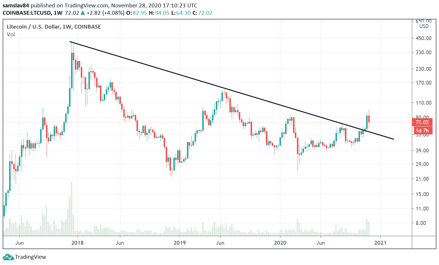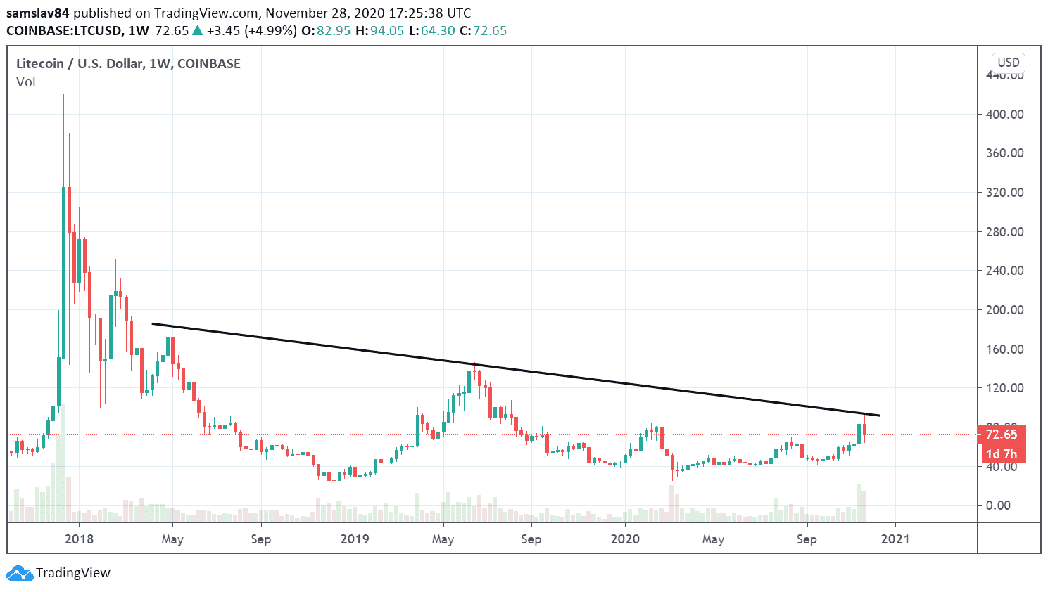 Vidno to hlavne na weekly grafe, kde sa práve odrazil od klesajúcej trendline. Stúpajúci trend z posledných mesiacov však vyzerá dosť presvedčivo a aj Litecoin by sa čoskoro mohol dočkať.