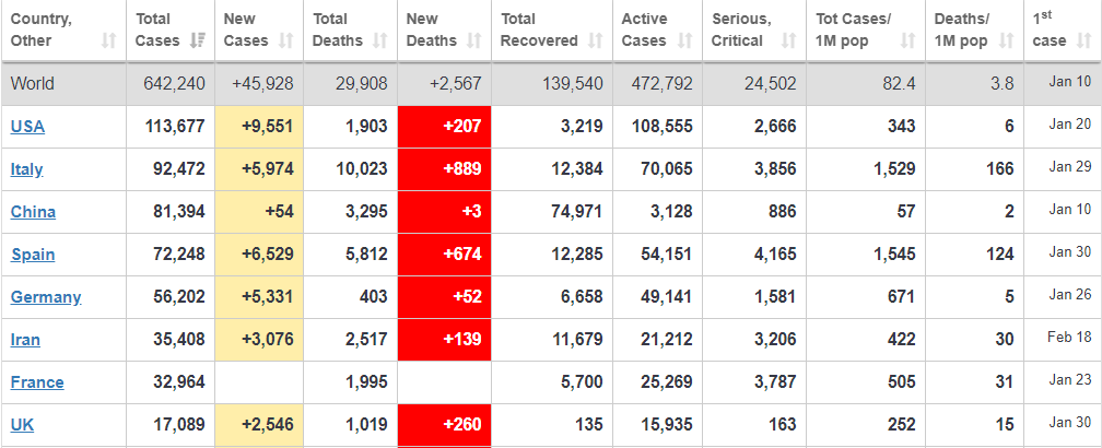 Korona sa šíri šialene rýchlo v USA, kde mali iba včera 13 000 nových prípadov. V taliansku to však nie je o moc lepšie. Doťahujú sa však aj ďalšie Európske krajiny. Viac sme situáciu rozobrali tu: USA majú ďalšie prvenstvo! Najväčší počet nakazených na celom svete