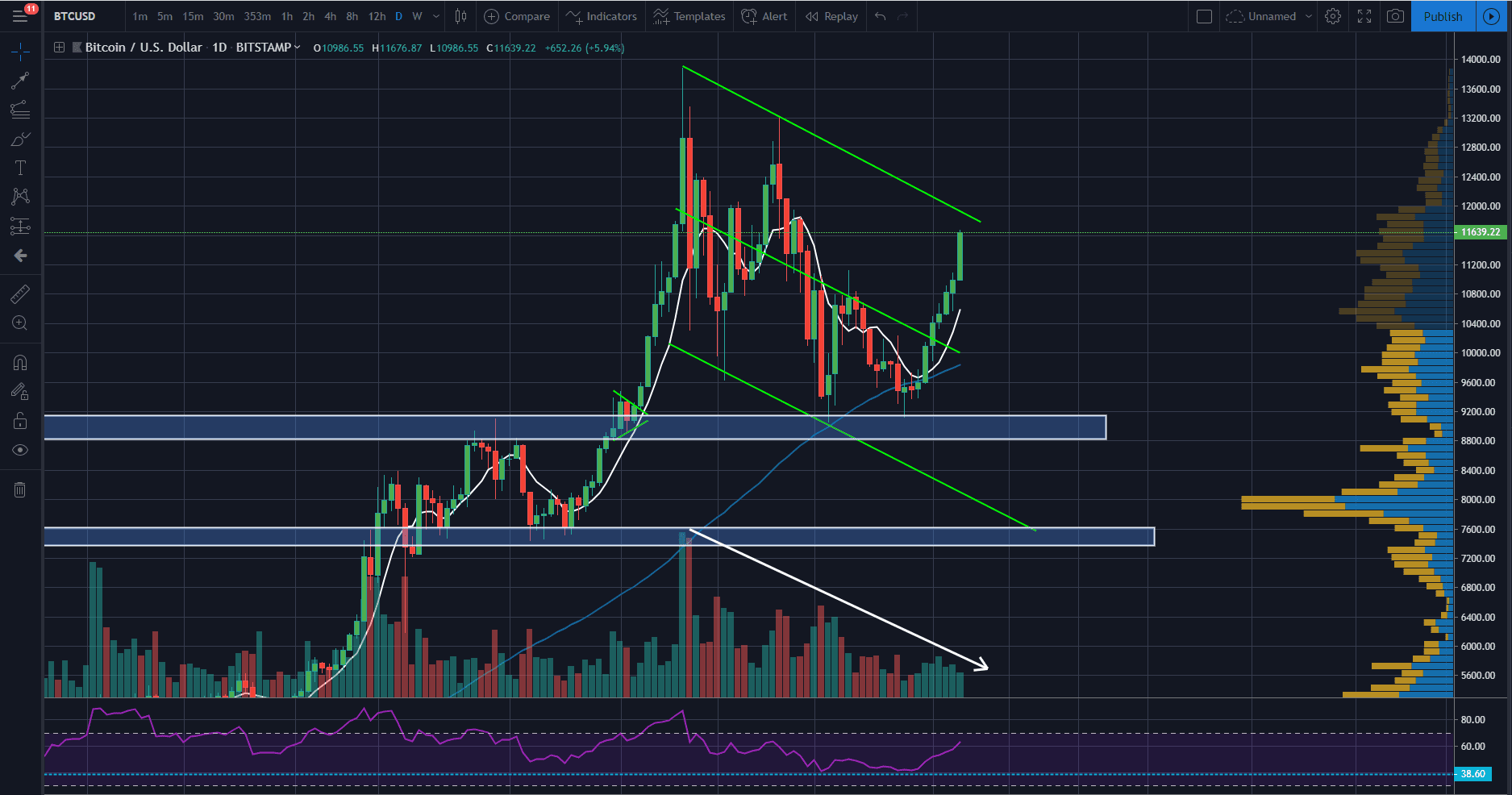 Bitcoin nám podrástol zhruba o 20% ale kým sa držíme v chanelli, tak sme stále viac bearish. Aj keď sa sentiment pomaly otáča a každý začína veriť, že hitneme 15 000 dolárov v najbližších dňoch, tak my tieto hry nehráme. Rešpektujeme naše analýzy a scenáre. Z môjho hľadiska je to naozaj 50 na 50. Dosť presne sme identifikovali pohyb na 11 600 dolárov v časoch, keď tomu nikto neveril a padali tu sumy ako 7 300 dolárov a nižšie. Momentálne sa však nemôžeme „poblázniť”, radšej držať emócie na uzde. Ja osobne si počkám, nech sa Bitcoin rozohodne. Ak aj vyletíme hore, tak si ho znova chytím na retracemente. Nejdem však riskovať zostrel nadol.