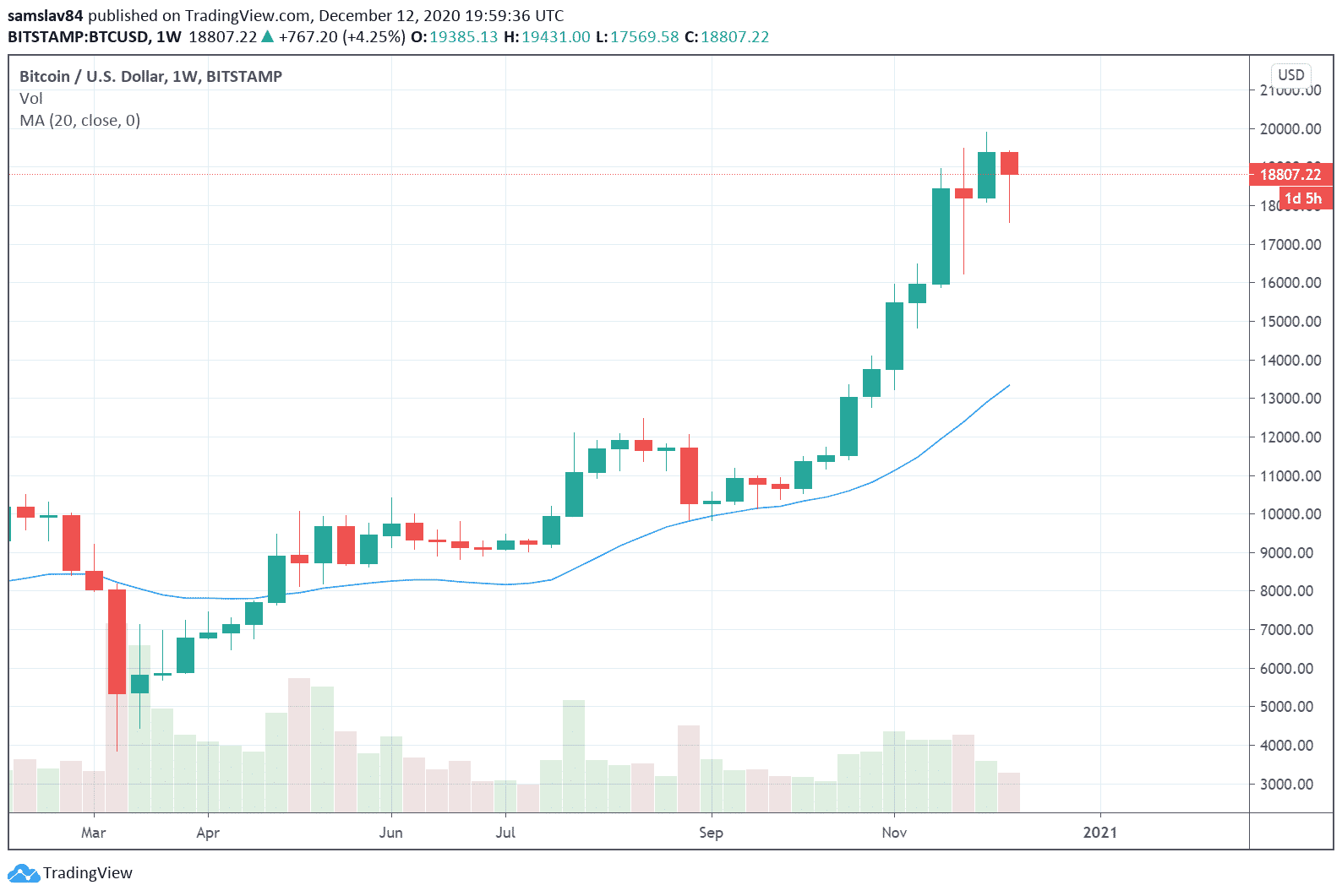 Bitcoin už tretí týždeň odmieta korekciu. Trhu momentálne chýba dynamika a obchoduje sa skôr na nižších timeframoch. Pokračuje tak konsolidácia pod historickým maximom z roku 2017, čo je pre inštitucionálnych investorov možno posledná šanca na lacný nákup.