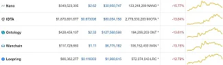 Väčšina kryptomien z TOP100 je v červených číslach. Bežné sú aj dvojciferné straty. Hlavne alty, ktoré za posledný týždeň zaznamenali veľké zisky, momentálne zažívajú krušné chvíle. V čase písania tohto článku IOTA klesla o 15%, TRON o 12%, NEO o 10%, Vechain o 12%…