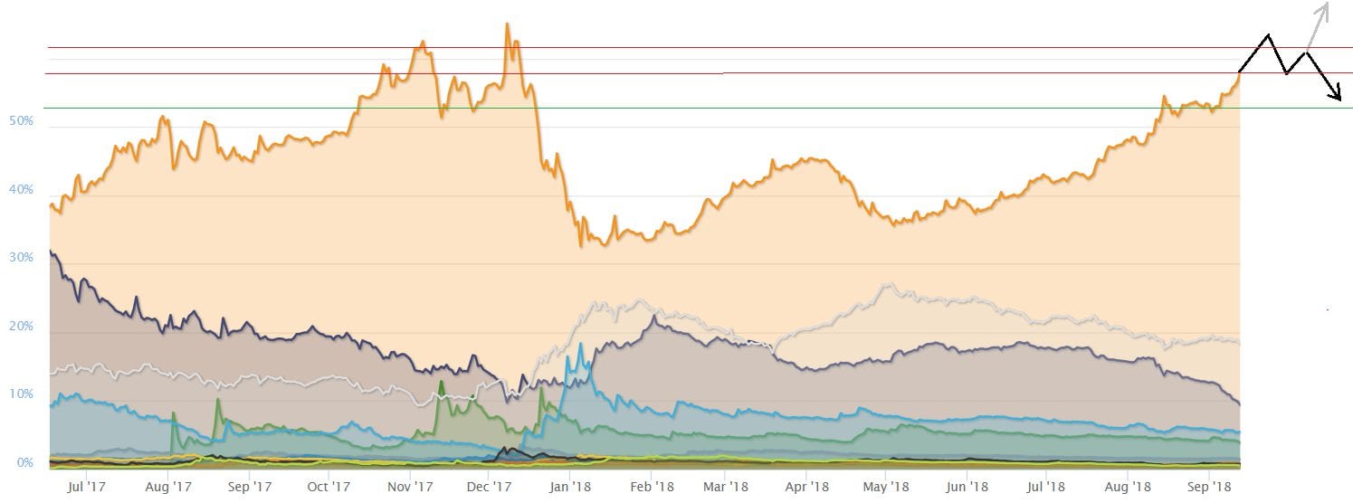 Každopádne, pri pohľade na dominanciu by sme mohli očakávať, že začne klesať krátko po prekročení hranice 60%. Maximum môže zaznamenať niekde v intervale 65-70%. Následný pád však pravdepodobne nebude spôsobený rastom trhu s altcoinami ale prudkým a krvavým pádom Bitcoinu.