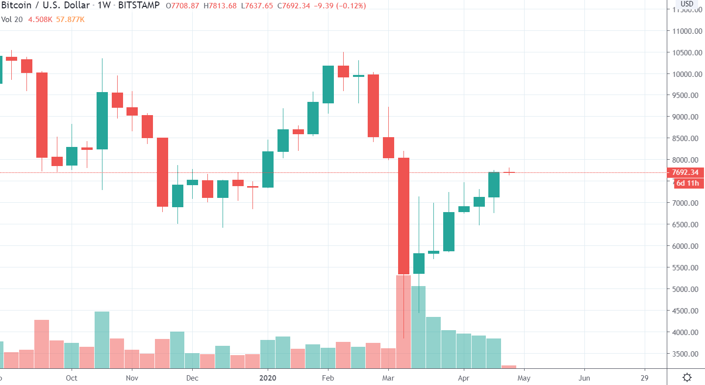 Trh s kryptomenami bol v nedeľu tesne pred polnocou opäť volatilný. Medvede sa s býkmi bili o to, kde uzavrie weekly svieca. Býci ju nakoniec nadstrelili nad 7700 $ a vytvorili tak v poradí už šiestu zelenú sviečku.