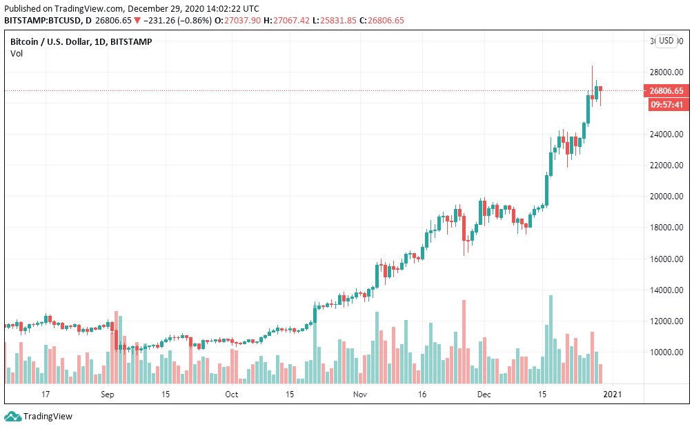 Bitcoin sa po dosiahnutí nedeľného historického maxima na hladine 28 400 $ stiahol a konsoliduje o 1000 – 2000 dolárov nižšie. Momentálne sa rozhoduje, ktorým smerom pôjde ďalší veľký pohyb. Ak sa pozrieme na posledných 10 mesiacov, môžeme si všimnúť, že po krátkej (alebo aj dlhej) konsolidácii vždy nasledoval rast. Výnimkou bol prepad zo septembra tohto roka.
