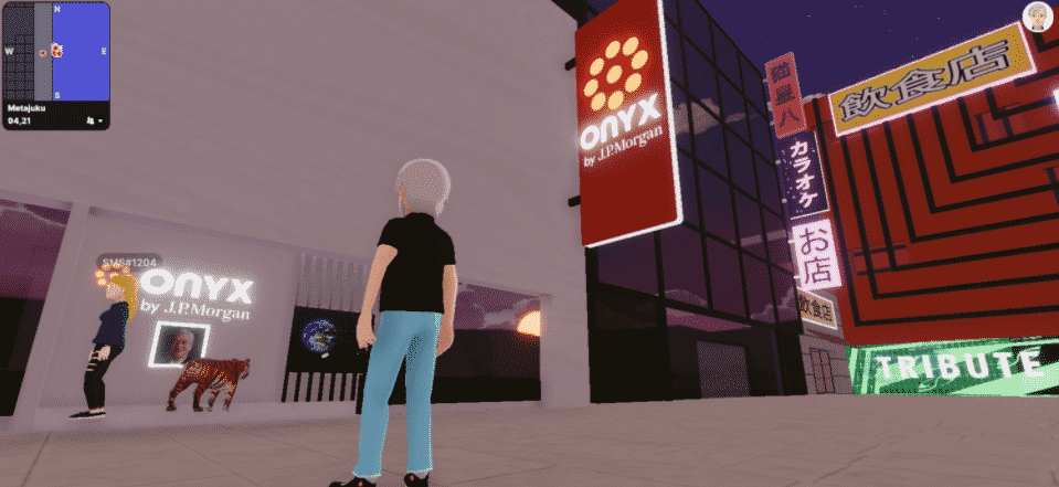 Návštevníkov salónika, ktorý sa nachádza v obchodnom dome Metajuku v Decentralande, víta túlajúci sa tiger a digitálny portrét Jamieho Dimona, generálneho riaditeľa spoločnosti JPMorgan. Ak hráči vyjdú hore, môžu si pozrieť prezentáciu manažéra o ekonomike kryptomien.