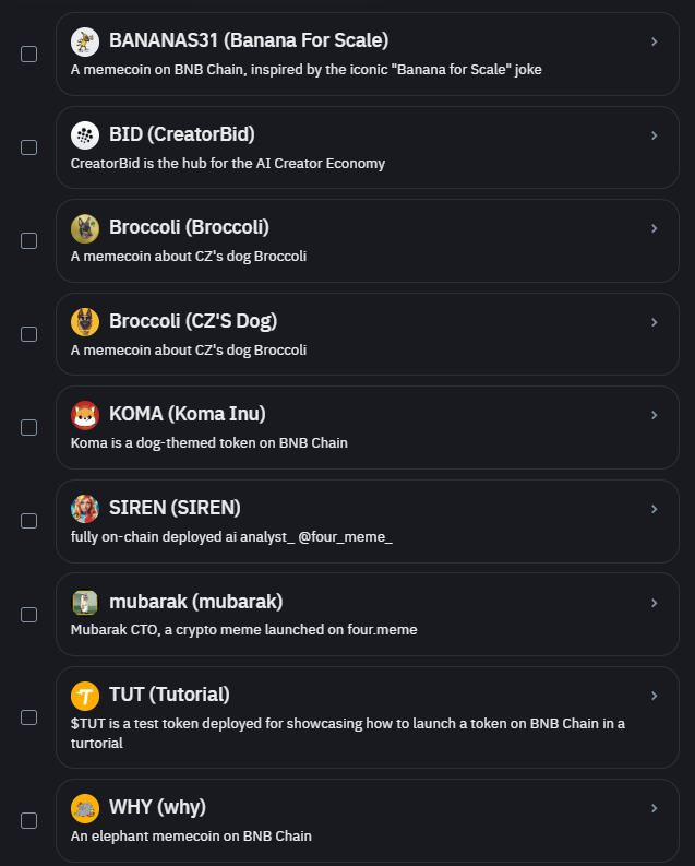 Medzi kandidátov pre toto kolo patria BANANAS31, BID, Broccoli, CZ’s Dog, KOMA, SIREN, Mubarak, TUT a WHY. Všetky tieto tokeny sú už zobrazené v Binance Alpha a zavedenie Vote to List nenahrádza existujúce požiadavky burzy na hĺbkovú previerku.