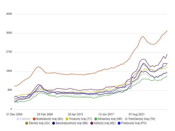 Priemerná cena nehnuteľnosti na Slovensku dosiahla v roku 20s25 úroveň 2 799 € za m², pričom Bratislava atakuje 3 598 €/m² a Košice dosahujú 2 469 €/m². Tieto čísla nie sú dočasné výkyvy, no sú súčasťou dlhodobého trendu, ktorý kopíruje vývoj v západnej Európe. Trh nehnuteľností na Slovensku dlhodobo rastie a s vysokou pravdepodobnosťou bude rásť aj naďalej, hoci presné tempo nikto nedokáže spoľahlivo predpovedať.