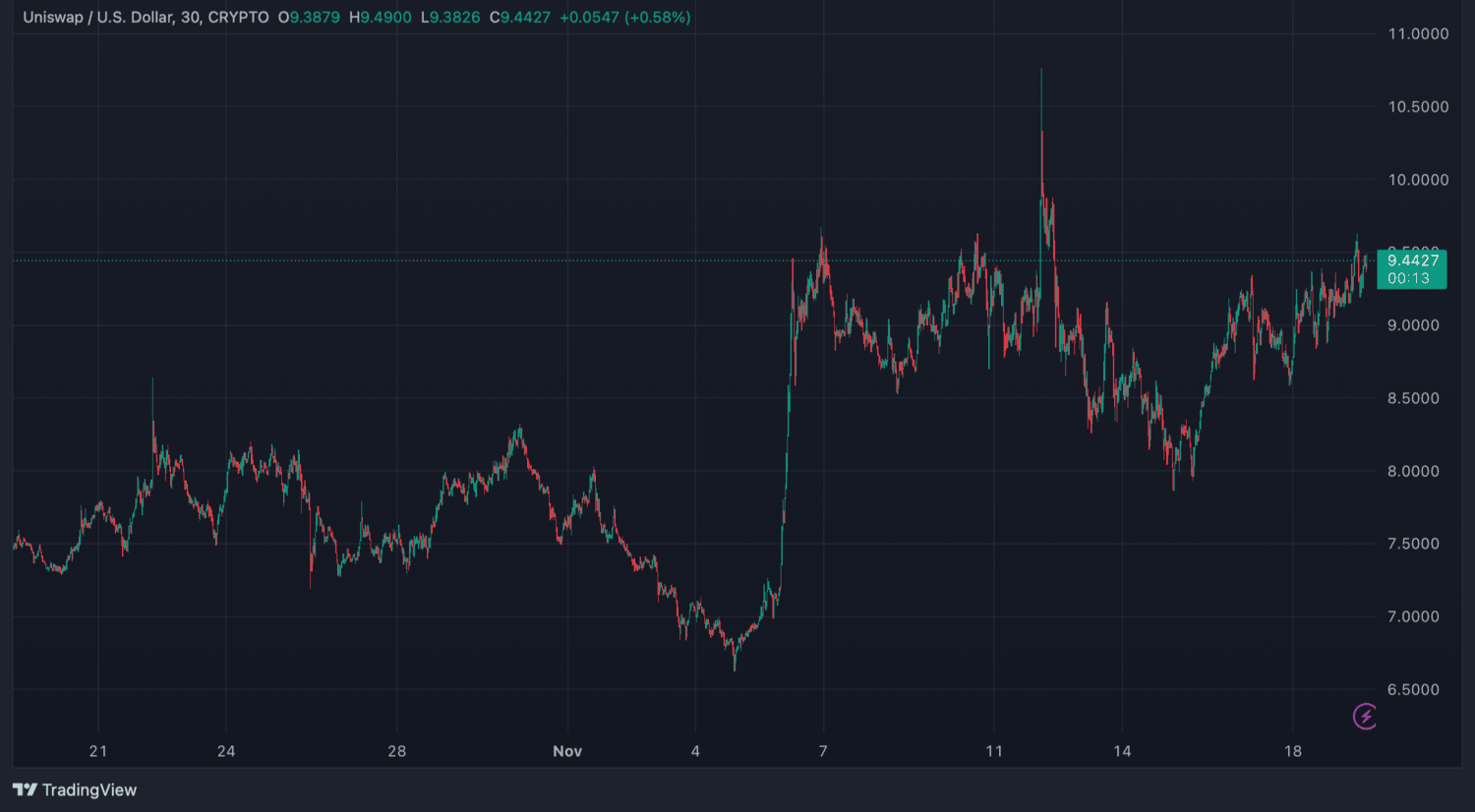 Uniswap je decentralizovaná burza na Ethereu, ktorá umožňuje používateľom obchodovať bez knihy objednávok. Jeho UNI token bol spustený, aby umožnil držiteľom hlasovať o zmenách platformy, ako sú poplatky a distribúcia tokenov. Token bol zavedený na podporu lojality po konkurencii zo strany SushiSwap. Uniswap distribuoval 150 miliónov UNI tokenov minulým používateľom, pričom každý dostal 400 UNI tokenov v hodnote viac ako 1 000 dolárov pri spustení. Platforma je open-source a umožňuje komukoľvek bezplatne listovať tokeny. Používatelia si zachovávajú kontrolu nad svojimi prostriedkami, čo ponúka bezpečnosť v porovnaní s centralizovanými burzami. Je to jedna z najväčších DeFi platforiem s aktívami presahujúcimi 3 miliardy dolárov.