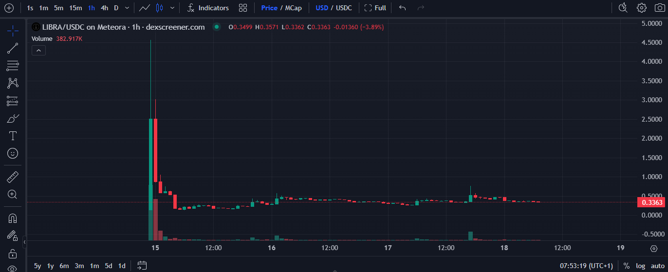 Vďaka tejto podpore kryptomena krátko dosiahla trhovú kapitalizáciu 4 miliardy dolárov, no jej hodnota rýchlo začala klesať, čo viedlo niektorých k označeniu projektu za podvod. Keď cena $LIBRA prudko padla, Milei svoj príspevok vymazal.