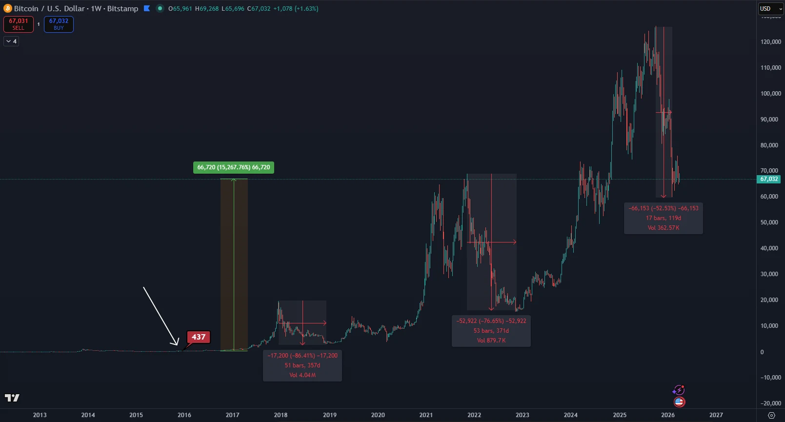 V súčasnosti vidíme ďalšiu významnú korekciu na úrovni približne 52 %. Pre neskúseného pozorovateľa to vyzerá ako katastrofa, no pre držiteľa z roku 2015 ide len o ďalší šum na dlhodobej krivke. Ak niekto prežije prepad o 80 %, prepad o polovicu ho už psychicky nerozhodí.