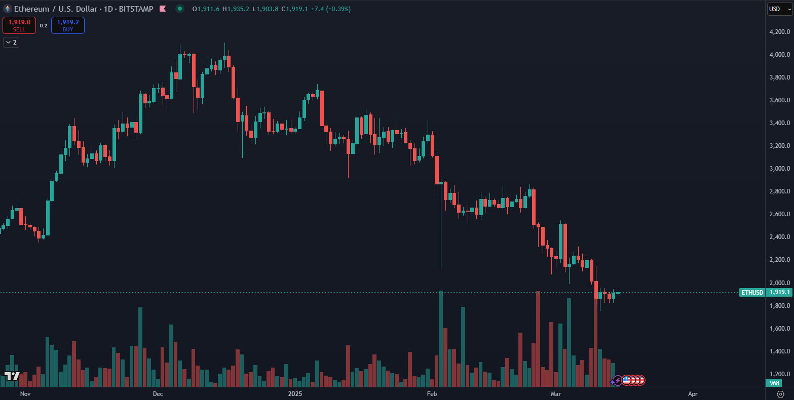 Podľa údajov TradingView Ethereum kleslo za posledné 3 mesiace o 55 % a stále nevie nájsť dno. Dokonca sa najväčšiemu altcoinu nepodarilo prekonať ani historické maximum z predošlého cyklu. Ethereum stále drží najvyššiu hodnotu z novembra 2021.